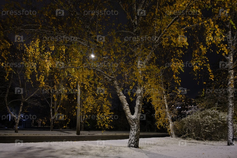 Россия, Новокузнецк. Вид на желтые березы на заснеженных аллеях ночного города в начале осени
