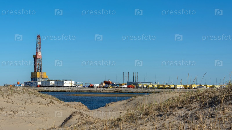 Бурение нефтяных и газовых скважин в пустынной местности. Песчаные холмы, редкая растительность. Красивое небо. Инфраструктура буровой установки