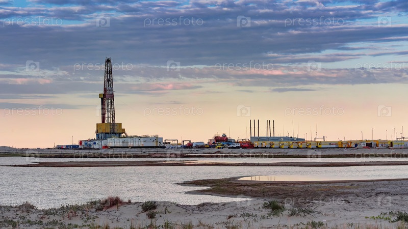 Бурение нефтяных и газовых скважин в пустынной местности. Песчаные холмы, редкая растительность. Красивое небо. Инфраструктура буровой установки
