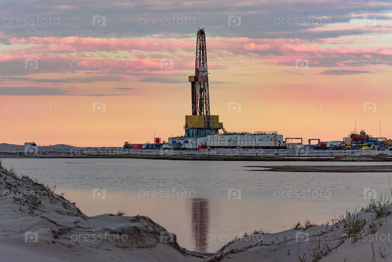 Бурение нефтяных и газовых скважин в пустынной местности. Песчаные холмы, редкая растительность. Красивое небо. Инфраструктура буровой установки