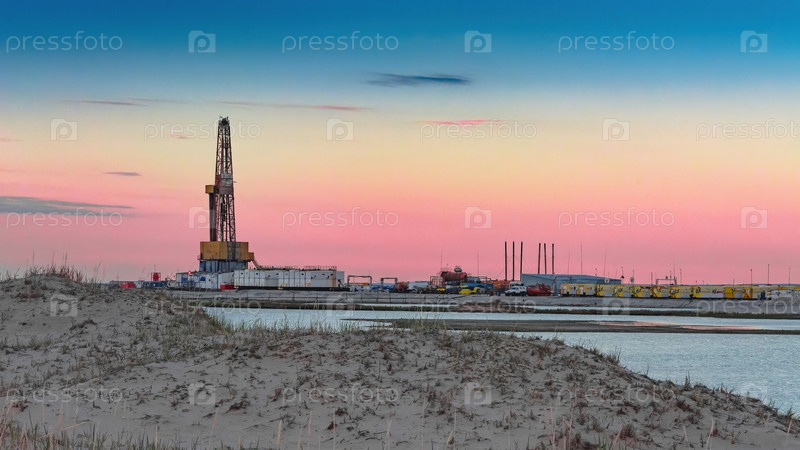Бурение нефтяных и газовых скважин в пустынной местности. Песчаные холмы, редкая растительность. Красивое небо. Инфраструктура буровой установки
