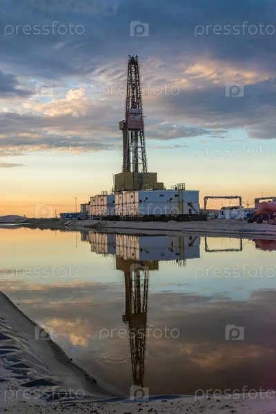 Бурение нефтяных и газовых скважин в пустынной местности. Песчаные холмы, редкая растительность. Красивое небо. Инфраструктура буровой установки
