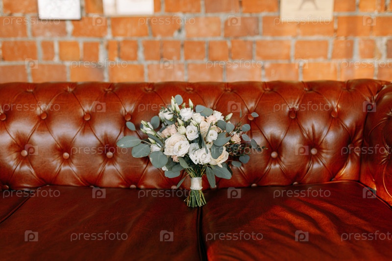 Изысканный и красивый букет ярких цветов, искусно размещенный на классическом винтажном кожаном диване