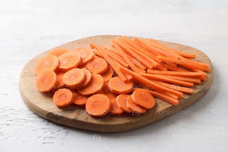 Ломтики и палочки свежей спелой моркови на деревянной доске, два вида нарезки овощей. Здоровое диетическое питание