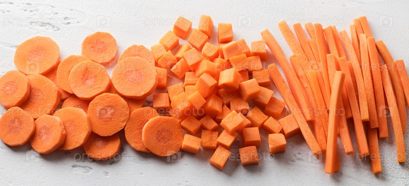 Свежая морковь ломтиками, кубиками и палочками на светло-сером фоне, три вида овощной нарезки, вид сверху, баннер