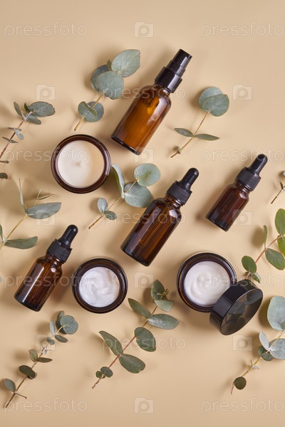 Набор косметических средств в янтарных стеклянных флаконах и банках на бежевом фоне с листьями эвкалипта. Набор средств по уходу за кожей для ежедневной рутины. Макет для дизайнеров