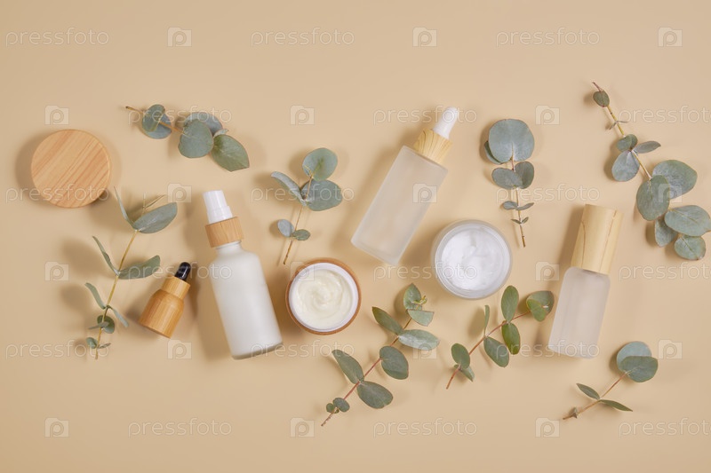 Белые матовые стеклянные косметические флаконы и банки с бамбуковыми крышками с корой дерева, эвкалипт на бежевом фоне. Набор косметических средств осень-осень