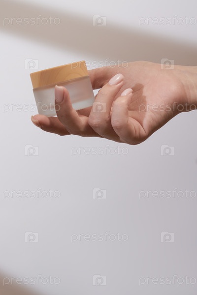 Женская рука держит макет стеклянной банки с кремом. Немаркированная упаковка для косметики в солнечном свете на белом фоне. Концепция ухода за кожей. Резкие тени