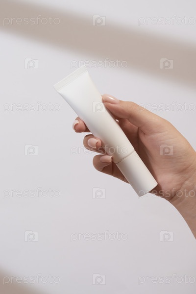Женская рука представляет собой макет тюбика крема. Немаркированная упаковка для косметики в солнечном свете на белом фоне. Концепция ухода за кожей. Резкие тени