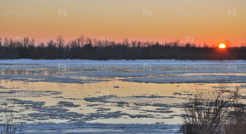 Первый луч солнца на льду реки Иртыш