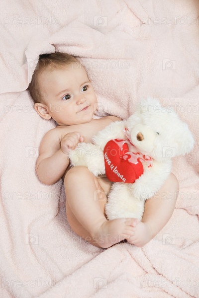 Ребенок обнимает плюшевого мишку на мягком одеяле