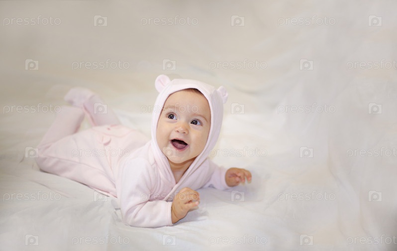 Очаровательный малыш ярко улыбается, одетый в уютный розовый наряд, идеально подходящий для запечатления трогательных моментов