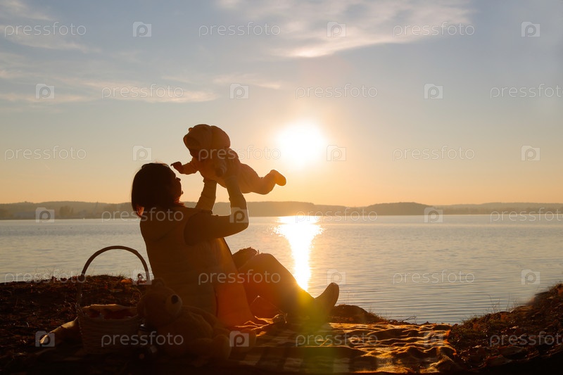 Трогательный момент, изображающий мать, нежно держащую на руках своего ребенка на закате у спокойной и ошеломляющей воды