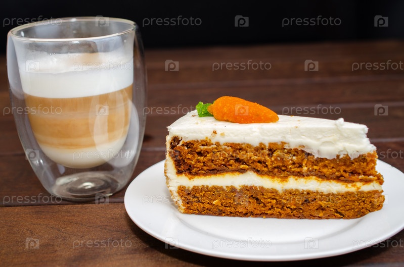 Морковный бисквит со сливками и грецкими орехами и кофе Капучино