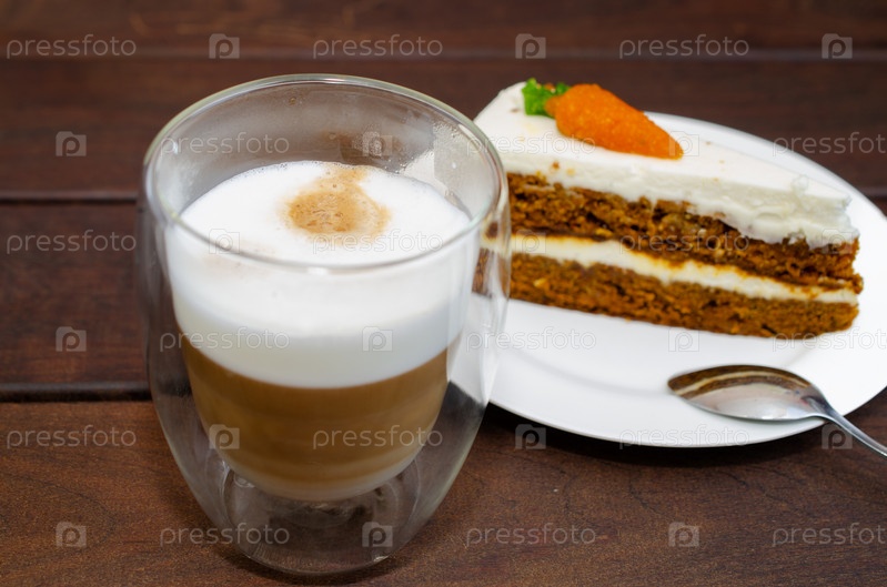 Морковный бисквит со сливками и грецкими орехами и кофе Капучино