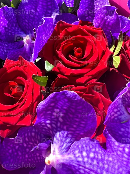 Яркий красочный букет из красных роз и фиолетовых орхидей