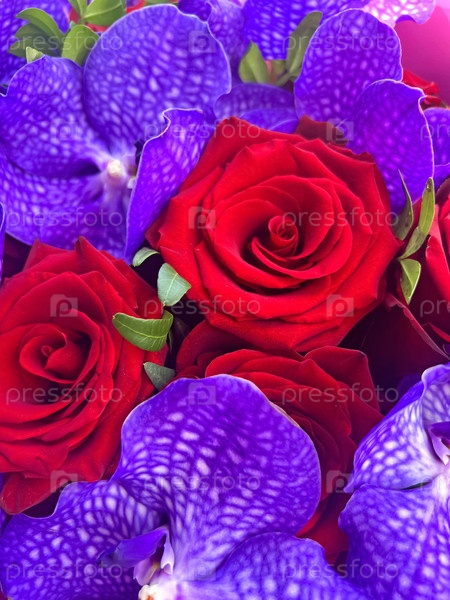 Яркий красочный букет из красных роз и фиолетовых орхидей