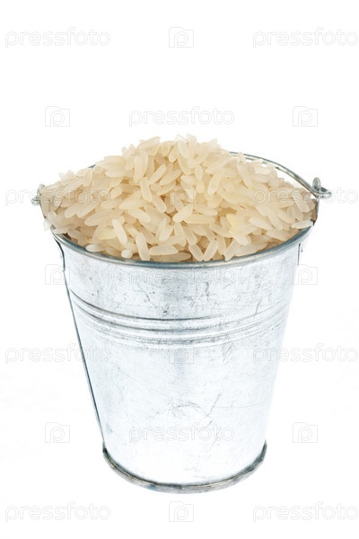 Полное ведро рисовых зерен на белом фоне
