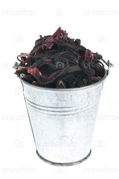 Полное ведро сухого гибискуса на белом фоне