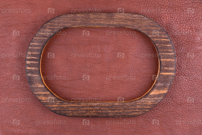 Овальная деревянная рама из дерева лежит на коричневой натуральной коже. Вид сверху
