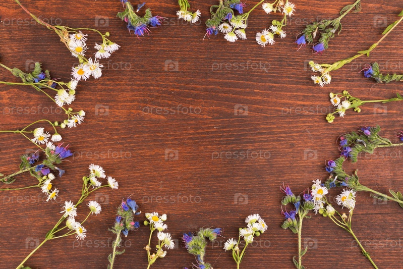 Рамка полевых цветов, лежащих на деревянной поверхности. Копировать пространство