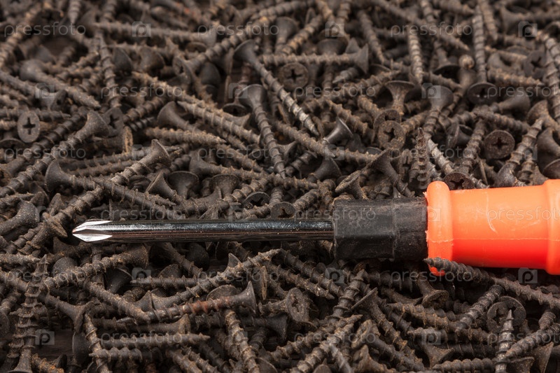 Отвертка лежит на металлических винтах в качестве фона