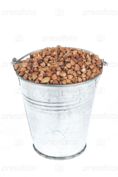 Полное ведро гречневой крупы на белом фоне