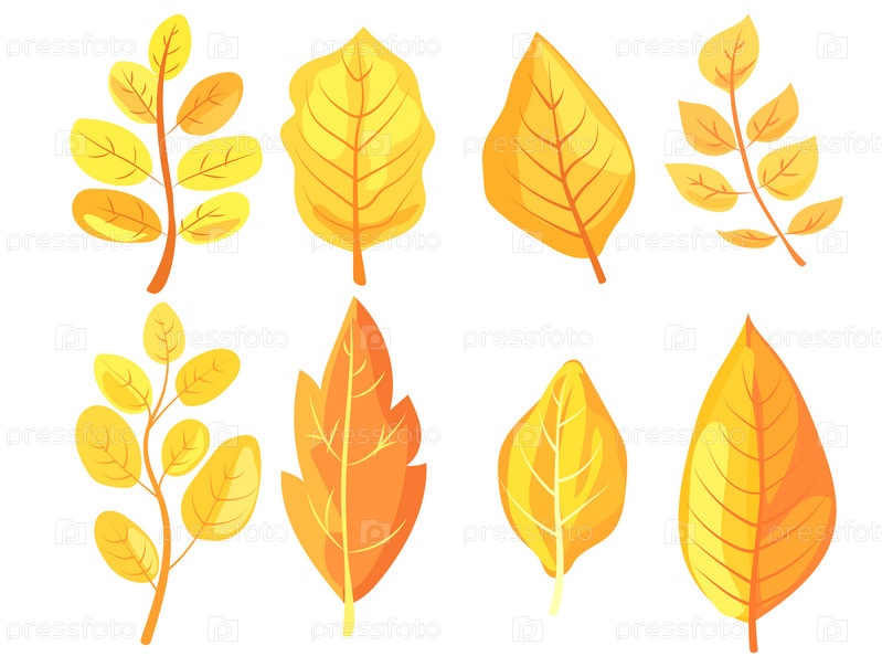 Различные красочные осенние листья разных форм, проиллюстрированные в ярком графическом стиле на белом фоне, представляющие осенний сезон. Векторная иллюстрация