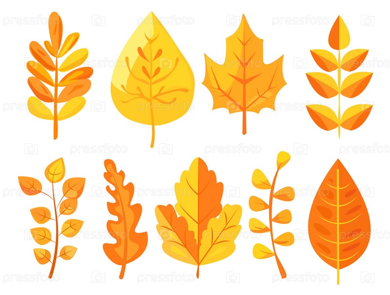 Различные красочные осенние листья разных форм, проиллюстрированные в ярком графическом стиле на белом фоне, представляющие осенний сезон. Векторная иллюстрация