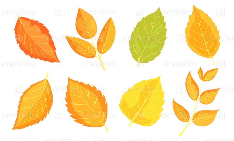 Различные красочные осенние листья разных форм, проиллюстрированные в ярком графическом стиле на белом фоне, представляющие осенний сезон. Векторная иллюстрация