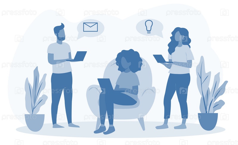 Иллюстрация, показывающая команду из трех человек с ноутбуками, обсуждающих идеи и общение по электронной почте, с декором из растений в офисной обстановке. Концепция командной работы и сотрудничества. Векторная иллюстрация
