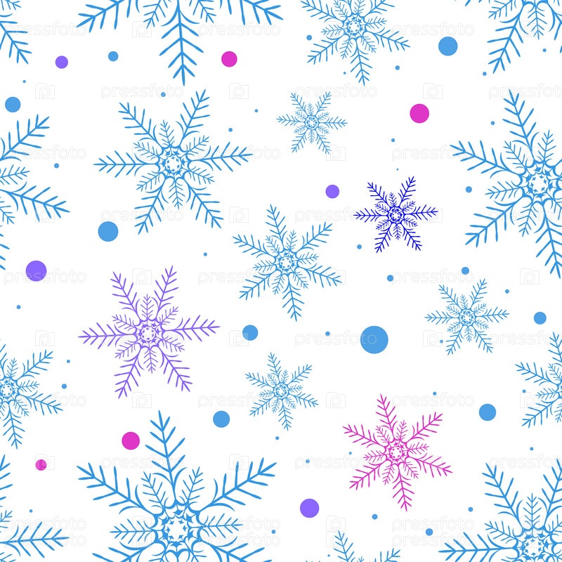 Синие, фиолетовые и розовые снежинки разных размеров расположены в бесшовном узоре на белом фоне. Узор включает в себя разбросанные точки соответствующих цветов, создавая праздничный и зимний вид
