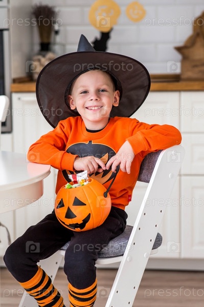 Маленький мальчик 5 лет в одежде для Хэллоуина и со сладостями в тыквенном джеке в интерьере кухни. Праздничный декор для украшения уютного дома
