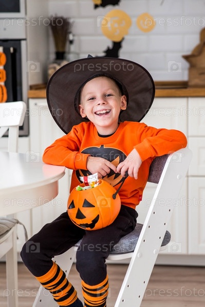 Маленький мальчик 5 лет в одежде для Хэллоуина и со сладостями в тыквенном джеке в интерьере кухни. Праздничный декор для украшения уютного дома