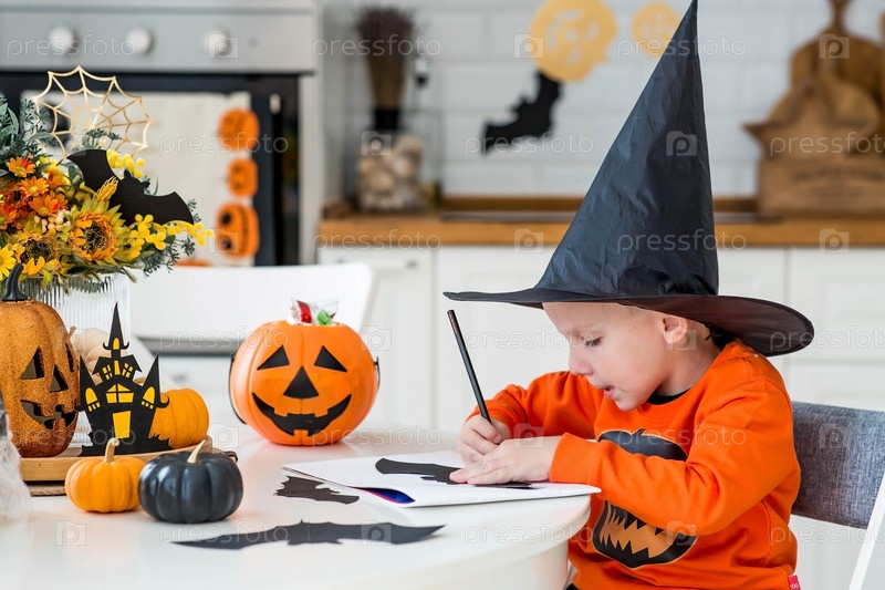 Маленький мальчик 5 лет рисует картину на тему Хэллоуина за столом в интерьере кухни. Праздничный декор для украшения уютного дома