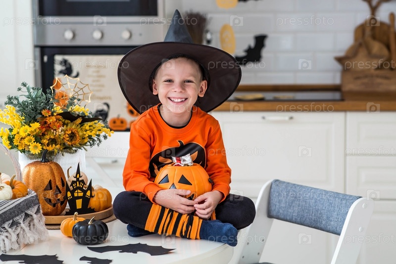 Маленький мальчик 5 лет в одежде для Хэллоуина и со сладостями в тыквенном джеке в интерьере кухни. Праздничный декор для украшения уютного дома