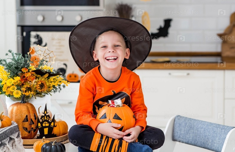 Маленький мальчик 5 лет в одежде для Хэллоуина и со сладостями в тыквенном джеке в интерьере кухни. Праздничный декор для украшения уютного дома