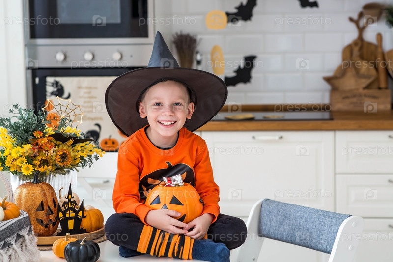 Маленький мальчик 5 лет в одежде для Хэллоуина и со сладостями в тыквенном джеке в интерьере кухни. Праздничный декор для украшения уютного дома