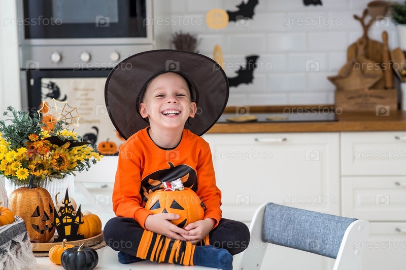 Маленький мальчик 5 лет в одежде для Хэллоуина и со сладостями в тыквенном джеке в интерьере кухни. Праздничный декор для украшения уютного дома