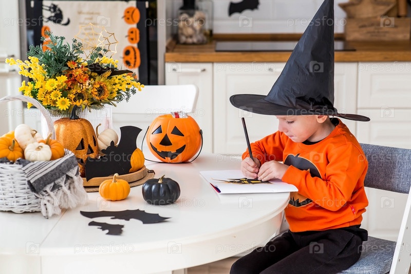 Маленький мальчик 5 лет рисует картину на тему Хэллоуина за столом в интерьере кухни. Праздничный декор для украшения уютного дома