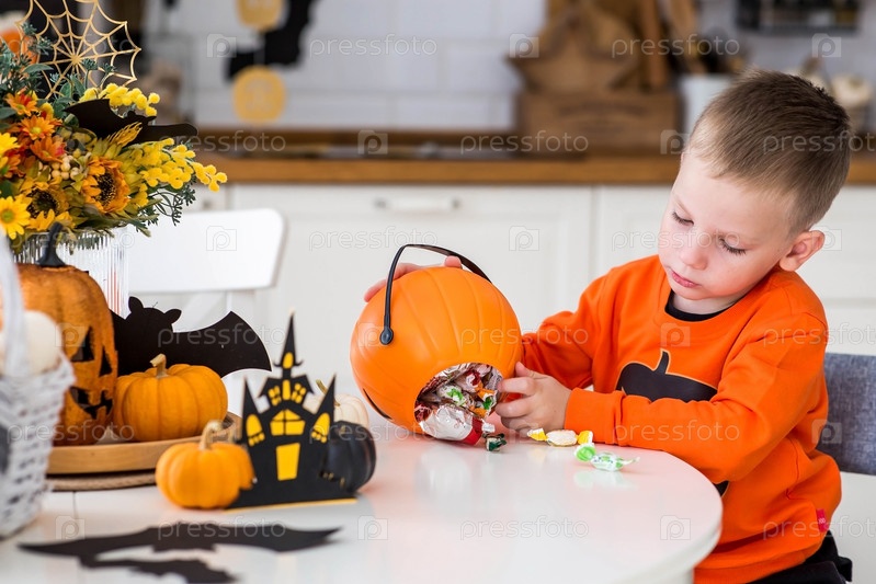 Маленький мальчик 5 лет в одежде для Хэллоуина и со сладостями в тыквенном джеке в интерьере кухни. Праздничный декор для украшения уютного дома