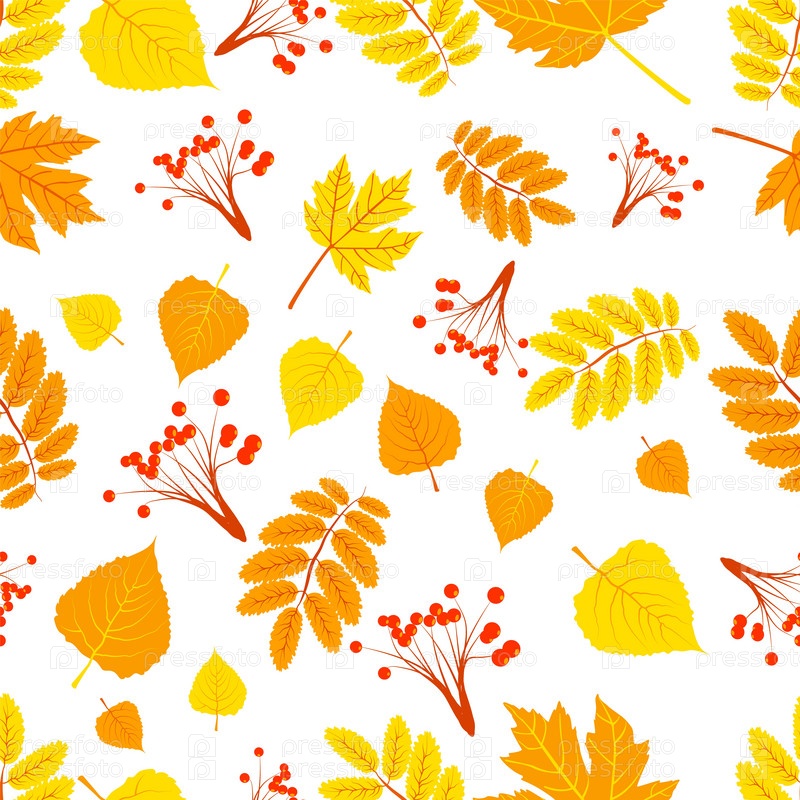 Бесшовный узор с различными осенними листьями и ягодами, выполненный в ярком графическом стиле на белом фоне. Векторная иллюстрация
