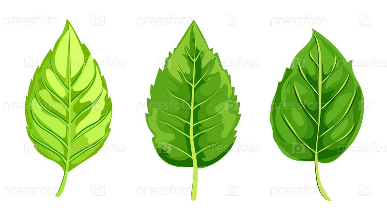 Коллекция из трех ярких зеленых листьев, представленных в реалистичном стиле на белом фоне. Векторная иллюстрация