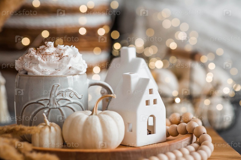 Вкусный тыквенный латте со взбитыми сливками и корицей в кружке на столе в интерьере гостиной. Осенний декор в доме. Скандинавский стиль
