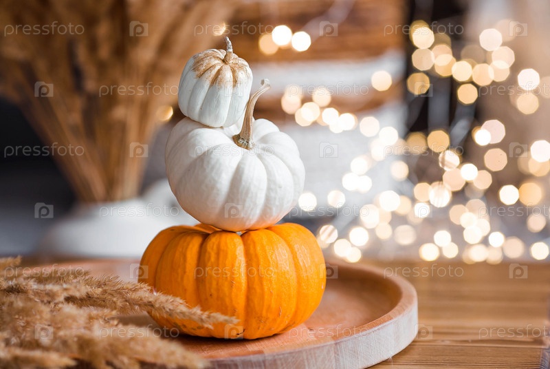 Натюрморт. Белые декоративные тыквы на столе в домашнем интерьере гостиной на фоне красивого бокового света. Концепция уютной осени
