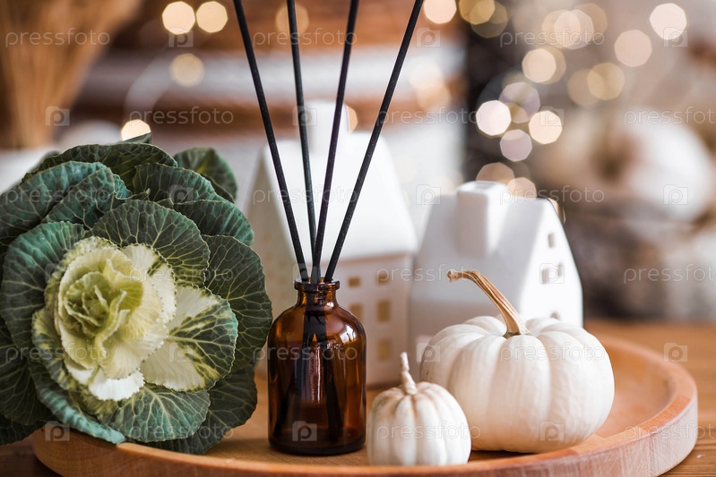 Аромадиффузор. Осенние ароматизированные духи для дома в стеклянном флаконе с палочками в качестве освежителя воздуха в доме и тыквами. Ароматерапия, уютная атмосфера, комфорт и расслабление