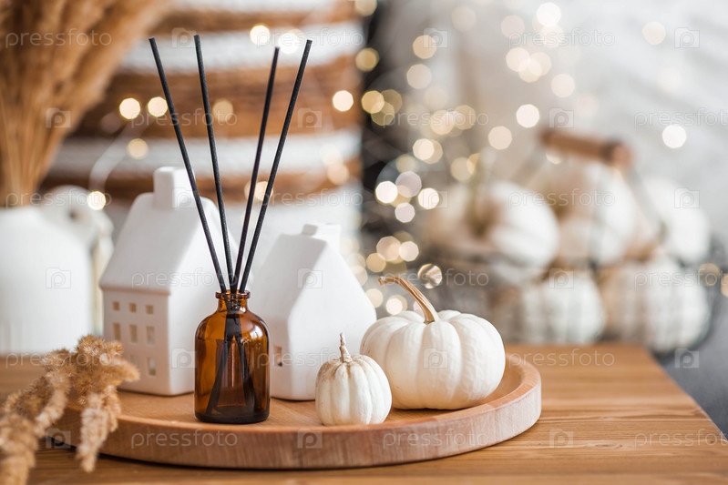 Аромадиффузор. Осенние ароматизированные духи для дома в стеклянном флаконе с палочками в качестве освежителя воздуха в доме и тыквами. Ароматерапия, уютная атмосфера, комфорт и расслабление
