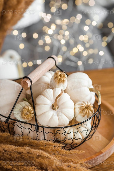 Натюрморт. Белые декоративные тыквы в железной чердачной корзине на столе в домашнем интерьере гостиной на фоне красивого бокового света. Концепция уютной осени