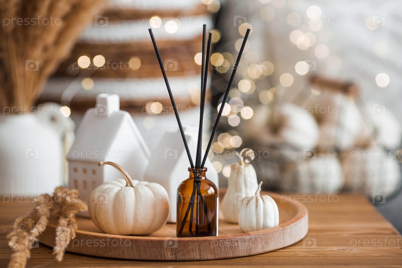 Аромадиффузор. Осенние ароматизированные духи для дома в стеклянном флаконе с палочками в качестве освежителя воздуха в доме и тыквами. Ароматерапия, уютная атмосфера, комфорт и расслабление