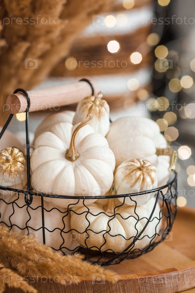 Натюрморт. Белые декоративные тыквы в железной чердачной корзине на столе в домашнем интерьере гостиной на фоне красивого бокового света. Концепция уютной осени
